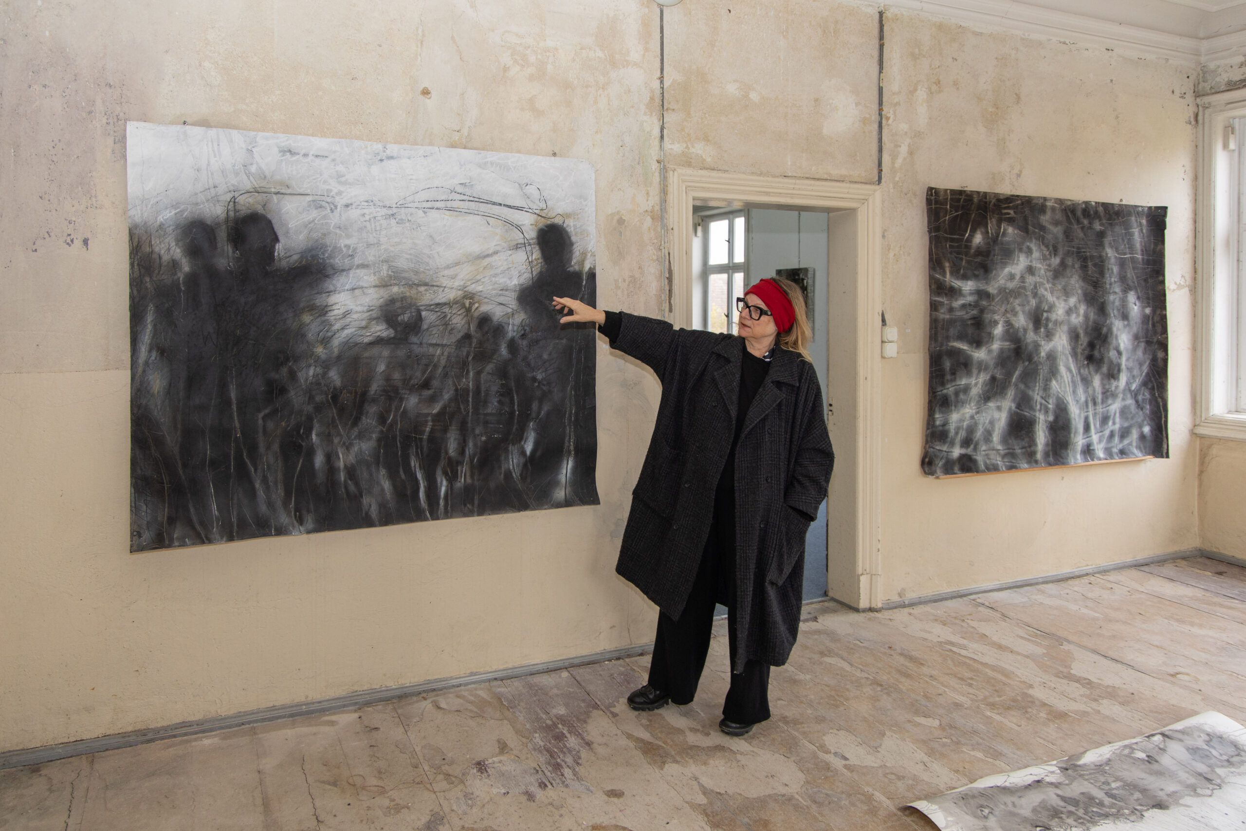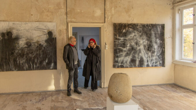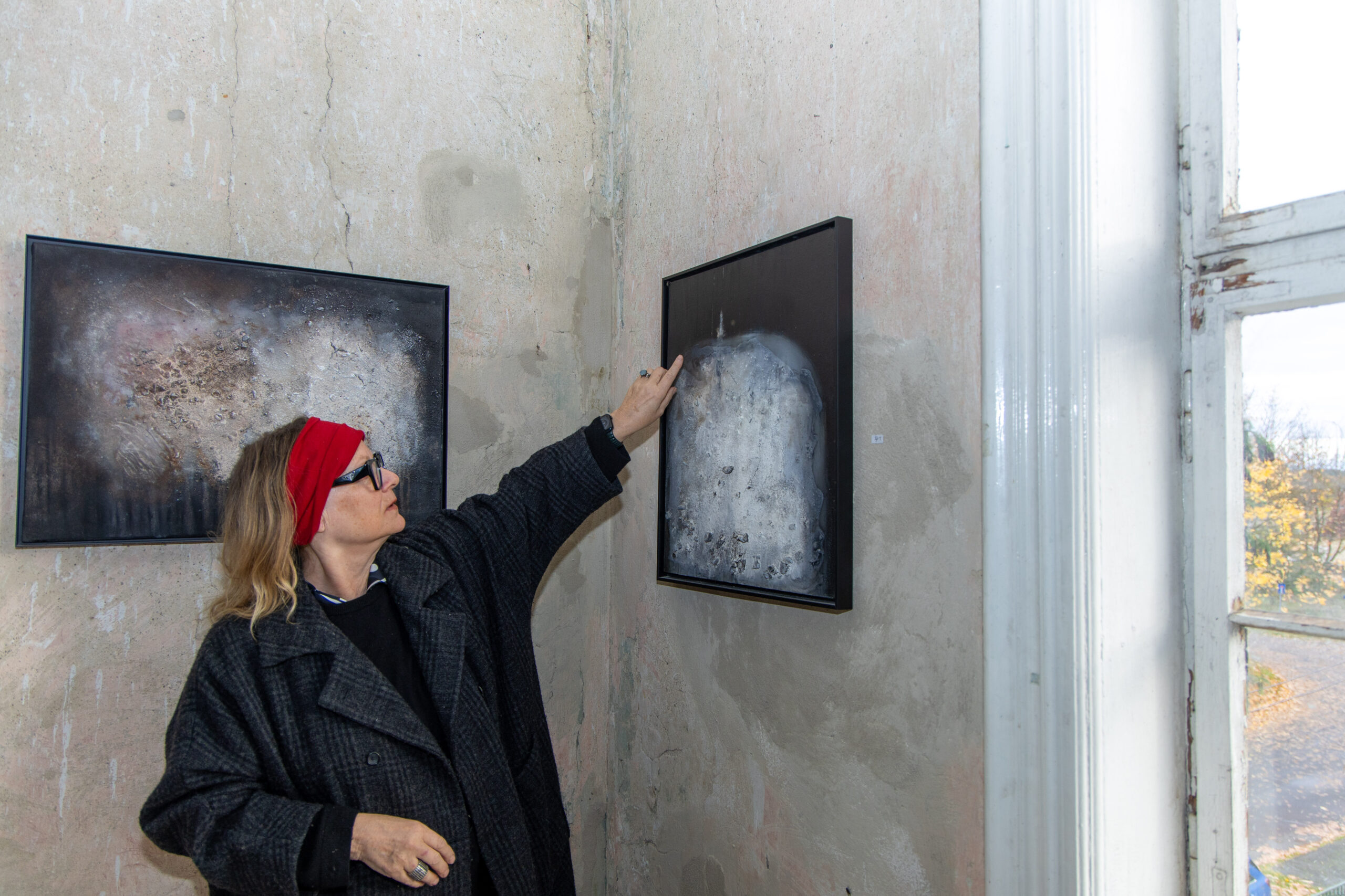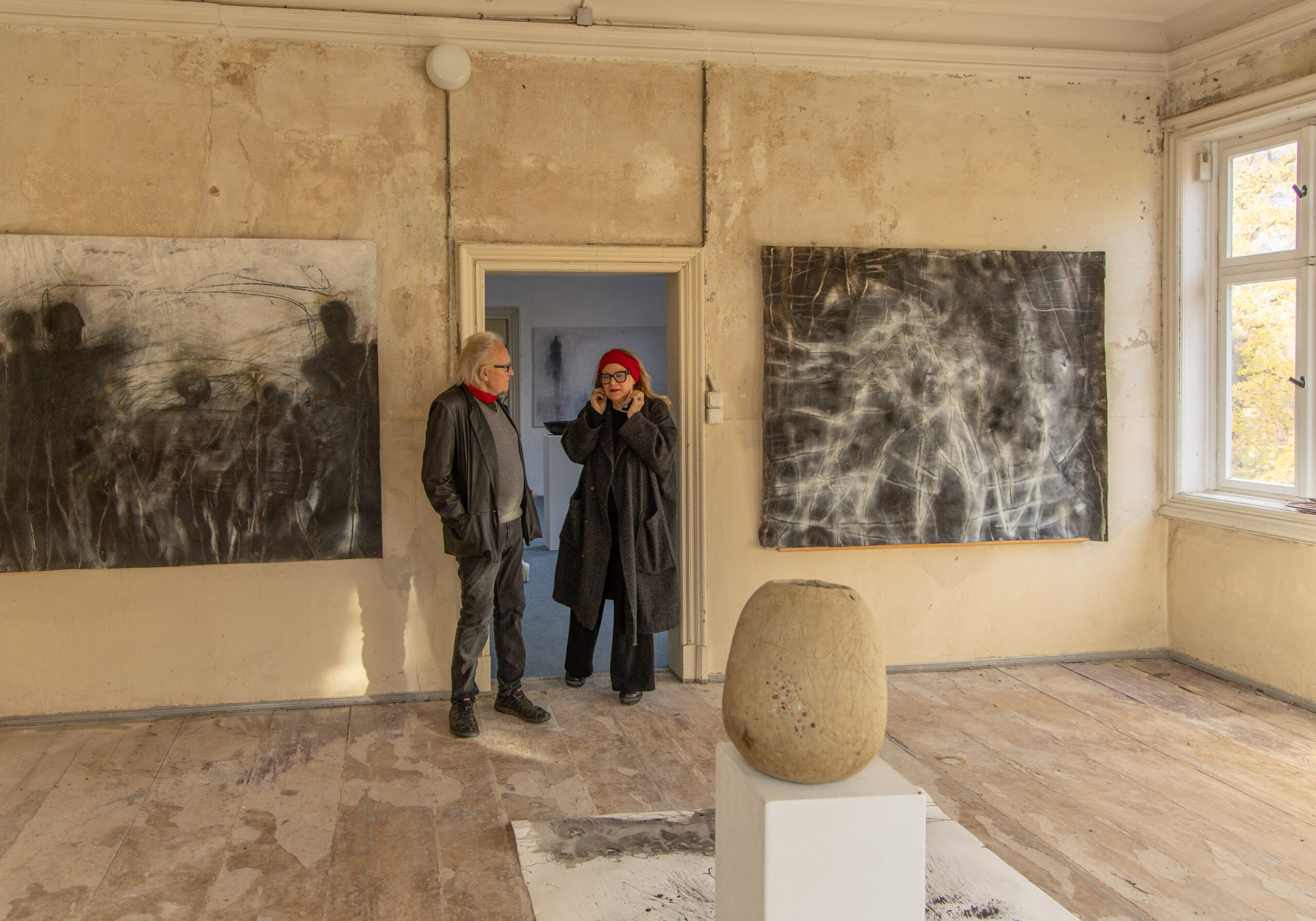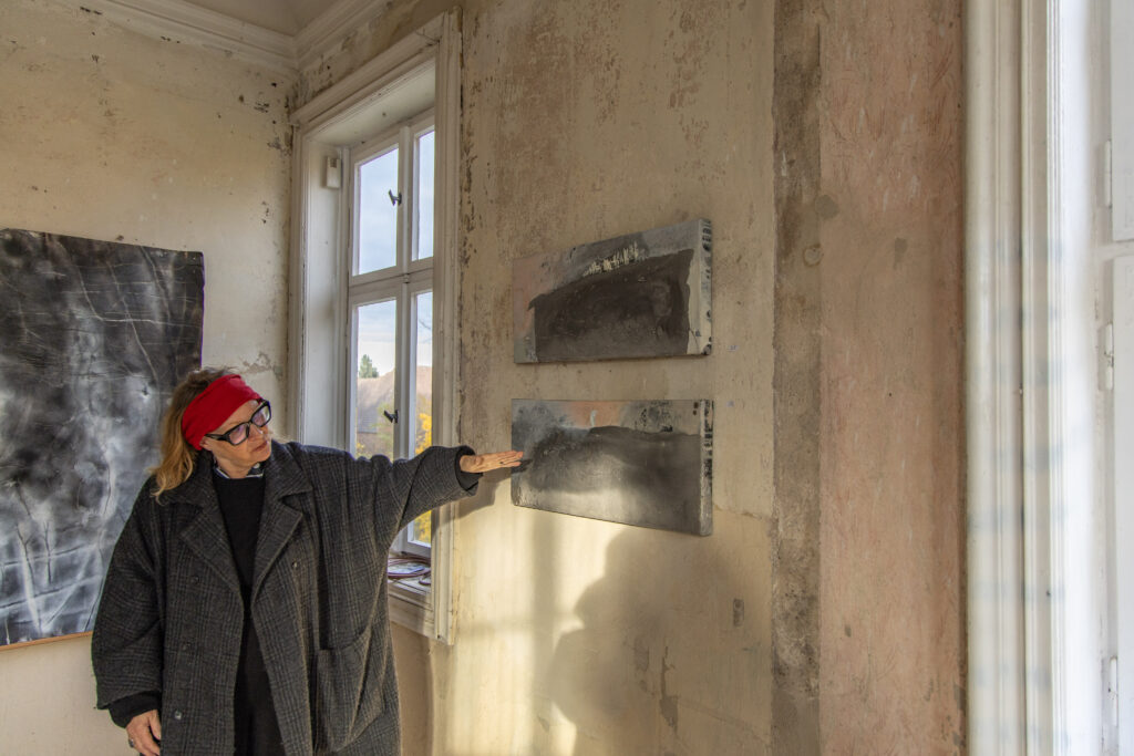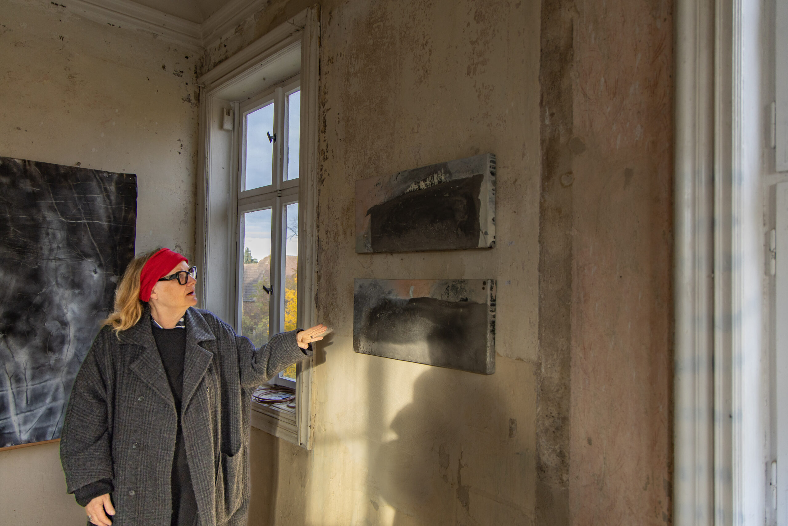 In diesen „unfertigen“ Räumen zeigt Katrin Meißner, die neben Calau auch in Leipzig ein Atelier unterhält, Werke unter dem Thema „Sequenzen: Kohle-Asche-Regen“. Die gebürtige Niederlausitzerin fasst damit zusammen, was die Region einst prägte und immer noch prägt. Ihr geht es um die Brüche und Zusammenbrüche, aber auch um die Perspektiven, die die Menschen herausforderten. Sie versteht unter dieser Thematik auch gleichzeitig die Dynamik der sich abspielenden Prozesse: Die Kohle und mit ihr die Asche sowie der ehemals saure Regen sind bald ganz verschwunden, anderes wird dennoch die Menschen weiterhin bewegen. Katrin Meißners Werke spiegeln wider, was die Menschen einst zum Lebensinhalt hatten, was sie erinnern lässt. Mit Asche – ja, es gibt noch Kraftwerksasche! – und oft im Regen, entstanden so zahlreiche Werke, die den Betrachter zum Nachdenken anregen.