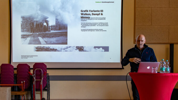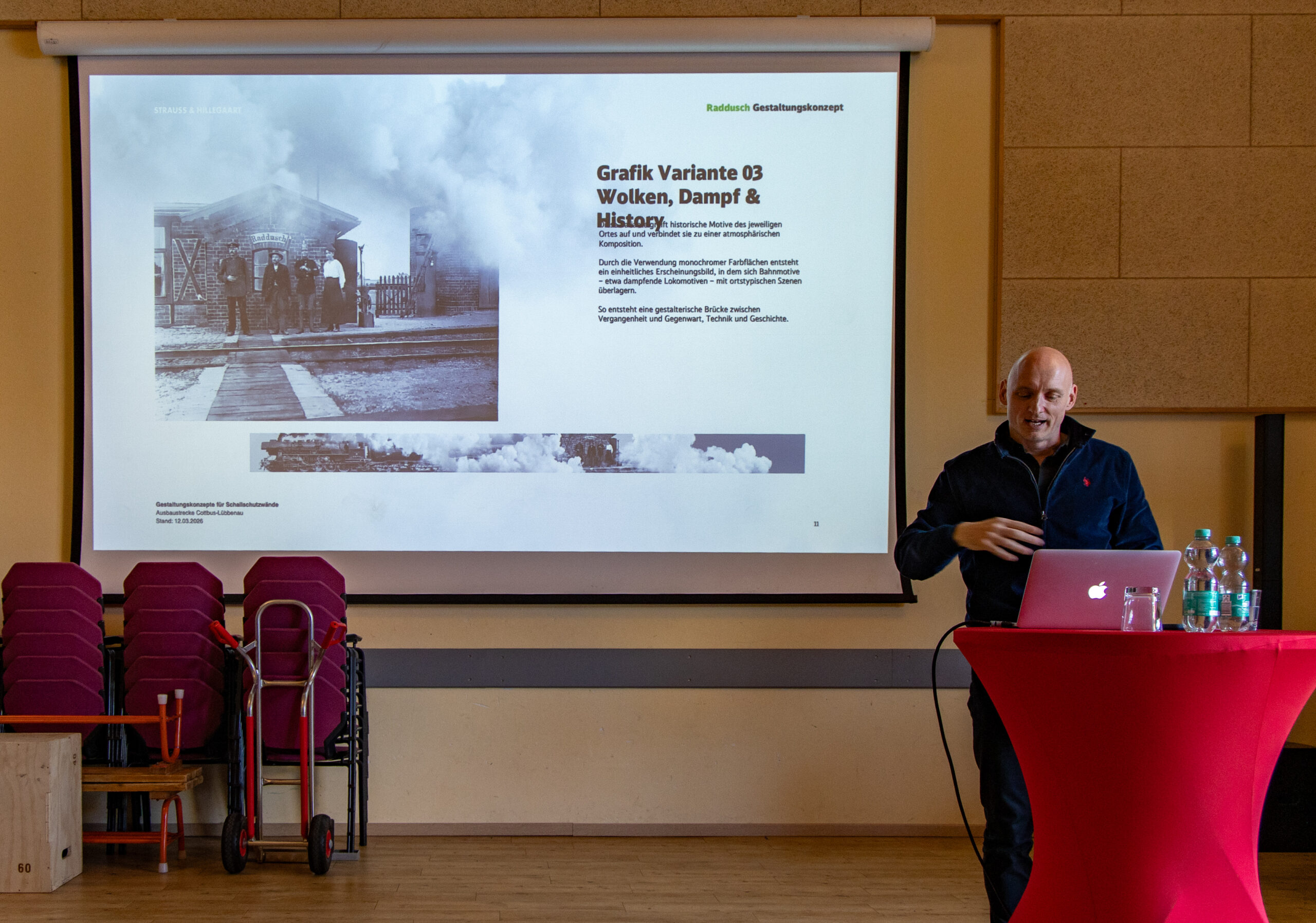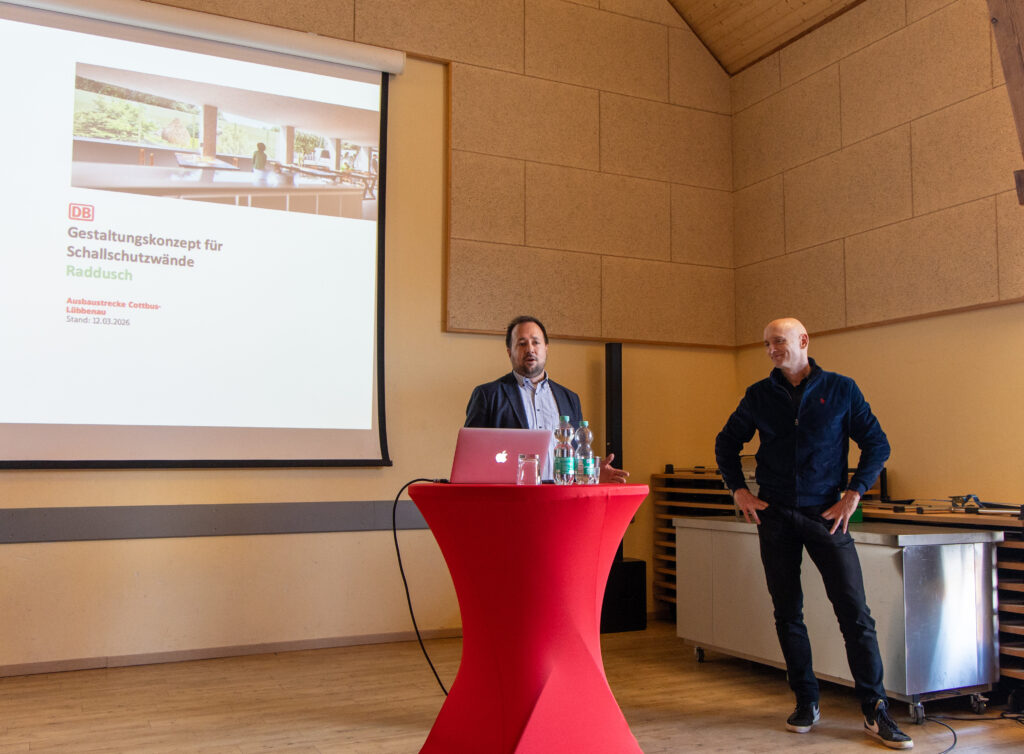 Fast vier Monate später, am 12. März 2026, erfolgte nun die Vorstellung der finalen Version der Wandgestaltung in der Radduscher Sport- und Kulturscheune. Markus Hillegaart vom Entwicklungsbüro und Stephan Baumgartl, Stakeholdermanager (das ist ein „Interessenausgleicher“) der Deutschen Bahn, stellten abschließend die Gestaltung noch einmal vor und beantworteten Fragen. Auch diesmal kamen die teils unterschiedlichen Vorstellungen zum Tragen, auch die der Bahn! Stephan Baumgartl: „Wir wollen unseren Kunden ein attraktives Umfeld bieten, wir möchten, dass der Radduscher Bahnhof sich im Interesse der Fahrgastentwicklung positiv darstellt und legen daher auch auf eine innenseitige Gestaltung großen Wert. Dies soll mit Spreewaldbildern und historischen Bahnmotiven gelingen. Grundsätzlich kommen drei grünlich gehaltene Farbverläufe zur Anwendung, keine einfarbig graue Wand wie vielerorts. Raddusch bekommt somit die attraktivste Schallschutzwand zwischen Cottbus und Lübbenau!“