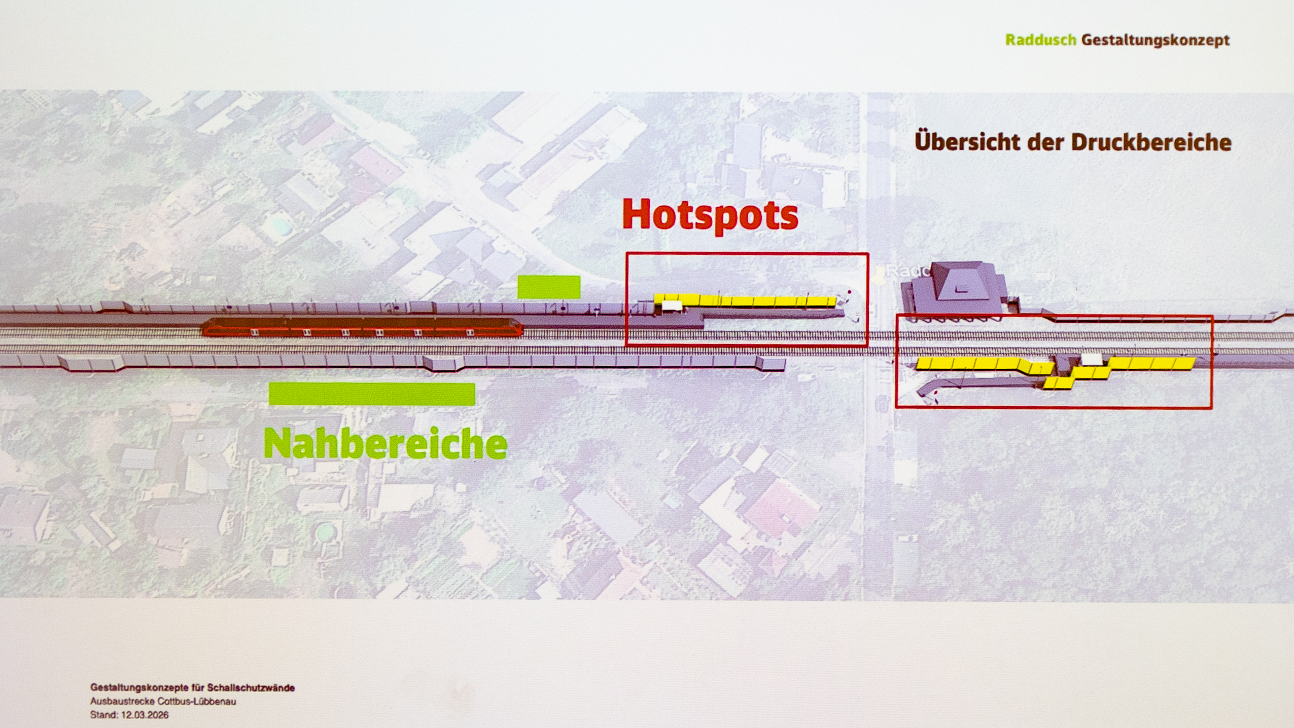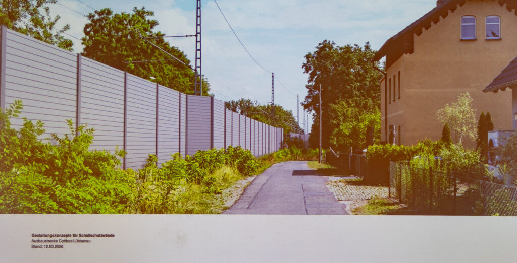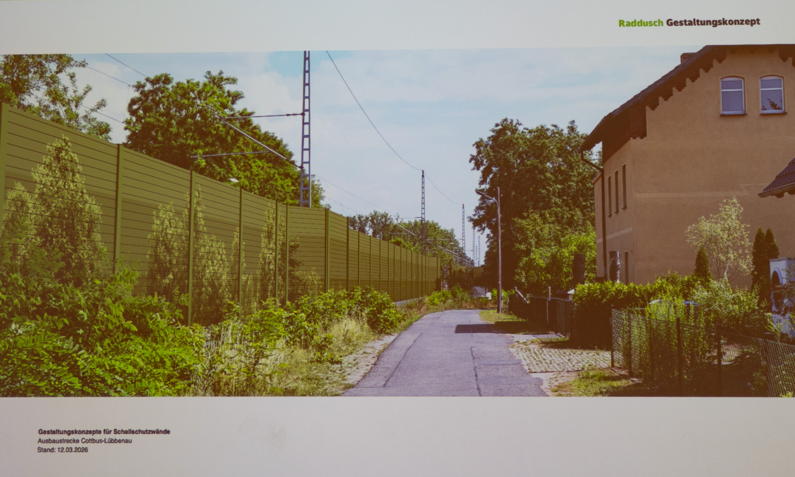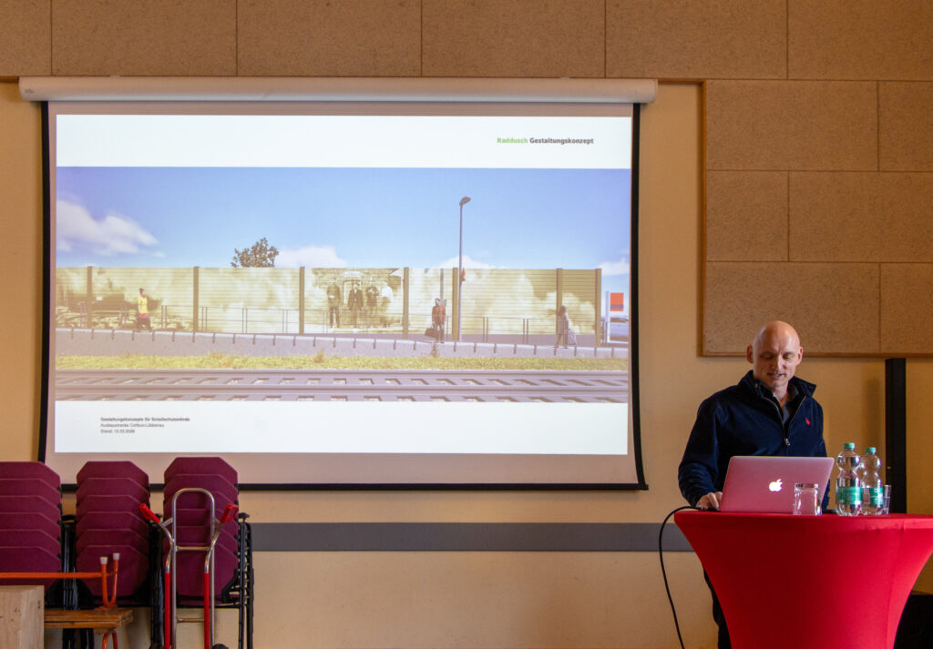 Bereits am 24. November des letzten Jahres wurde vom Entwicklungsbüro Strauss & Hillegaart den Radduscherinnen und Radduschern eine Konzeption zur Gestaltung der die Ortslage begleitenden Lärmschutzwände vorgestellt. Diese befinden sich beidseitig der geplanten zweigleisigen Strecke mit einer Ausdehnung von 850 Meter, insgesamt sind es 1,2 Kilometer Schutzwand. Die Höhe beträgt zwischen zwei und vier Meter.