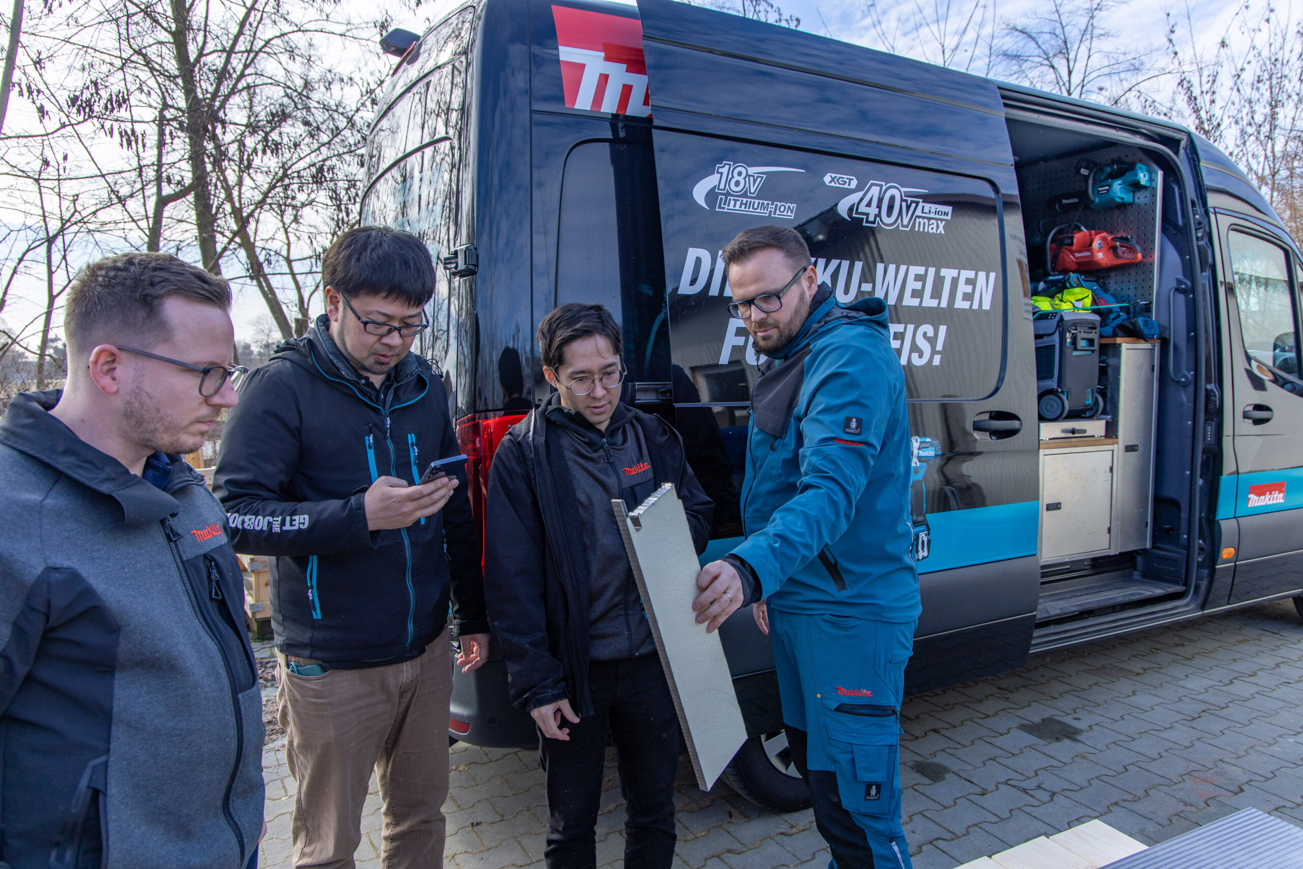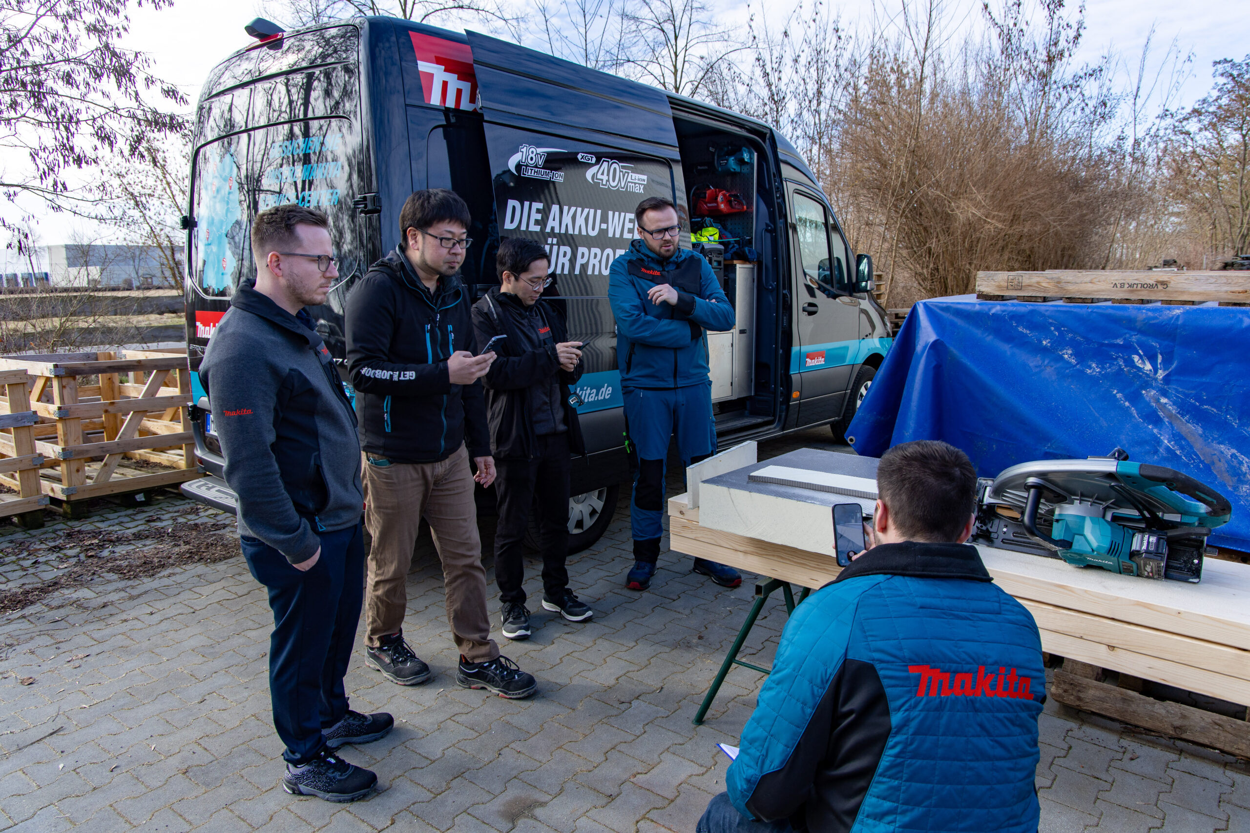 Der Radduscher Unternehmer hat mit seinem Maschinenpark „aus einer Hand“ die in Europa ansässigen Firmenvertreter auf sich aufmerksam gemacht. „Wir möchten uns den Einsatz unserer Technik mal vor Ort ansehen, um noch Schwachstellen zu erkennen und in der Folge auszumerzen“, sagt Hanai Takamasa, Product Development Manager in der Brüsseler Niederlassung. Begleitet wurde er von einem Kollegen, einem Makita Anwendungstechniker sowie zwei Kollegen aus dem Produktmarketing.