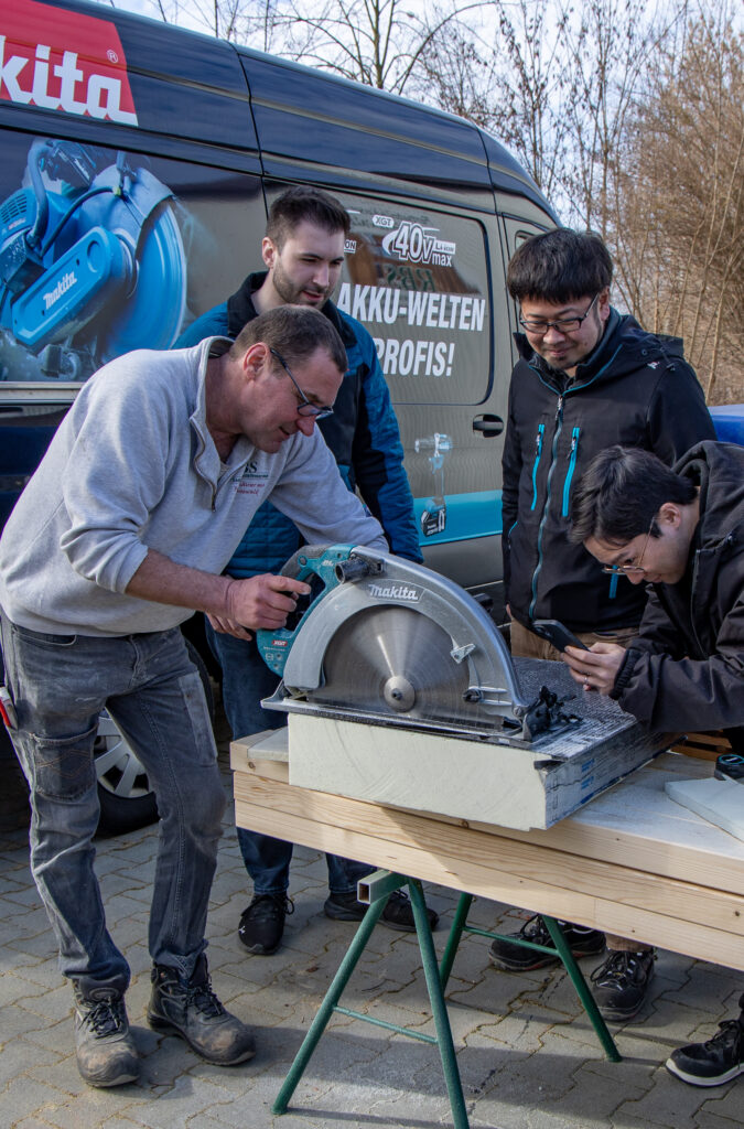 Karsten Pöschla hatte die Makita-Vertreter, die ihre deutsche Niederlassung in Ratingen (NRW) haben, beim letztjährigen Frühlingsfest der ELG Calau kennengelernt. Er konnte mit ihnen ins Gespräch kommen und seine Vorschläge zur Produktverbesserung vortragen. Ein damals vereinbarter Besuchstermin in seiner Firma fand nun in Raddusch statt, mit dabei auch die japanischen Vertreter der Europa-Niederlassung in Brüssel. Karsten Pöschla testet aktuell eine der insgesamt nur vier bisher in Deutschland im Einsatz befindlichen Handkreissägen. Für ihn ist es wichtig, dass er beispielsweise bei Arbeiten auf einem Hausdach kein kabelgebundenes Gerät einsetzt. Die neue 40-Volt-Kreissäge ist den kabelgebundenen Geräten der anderen Anbieter deutlich überlegen, wie Karsten Pöschla nach nur wenigen Einsatztagen einschätzt. Makita hat hier ein Alleinstellungsmerkmal aufzuweisen. Der Radduscher Unternehmer hat inzwischen nur noch Geräte des japanischen Anbieters in seiner Firma im Einsatz, insgesamt sind es Geräte für 12 verschiedene Anwendungen.