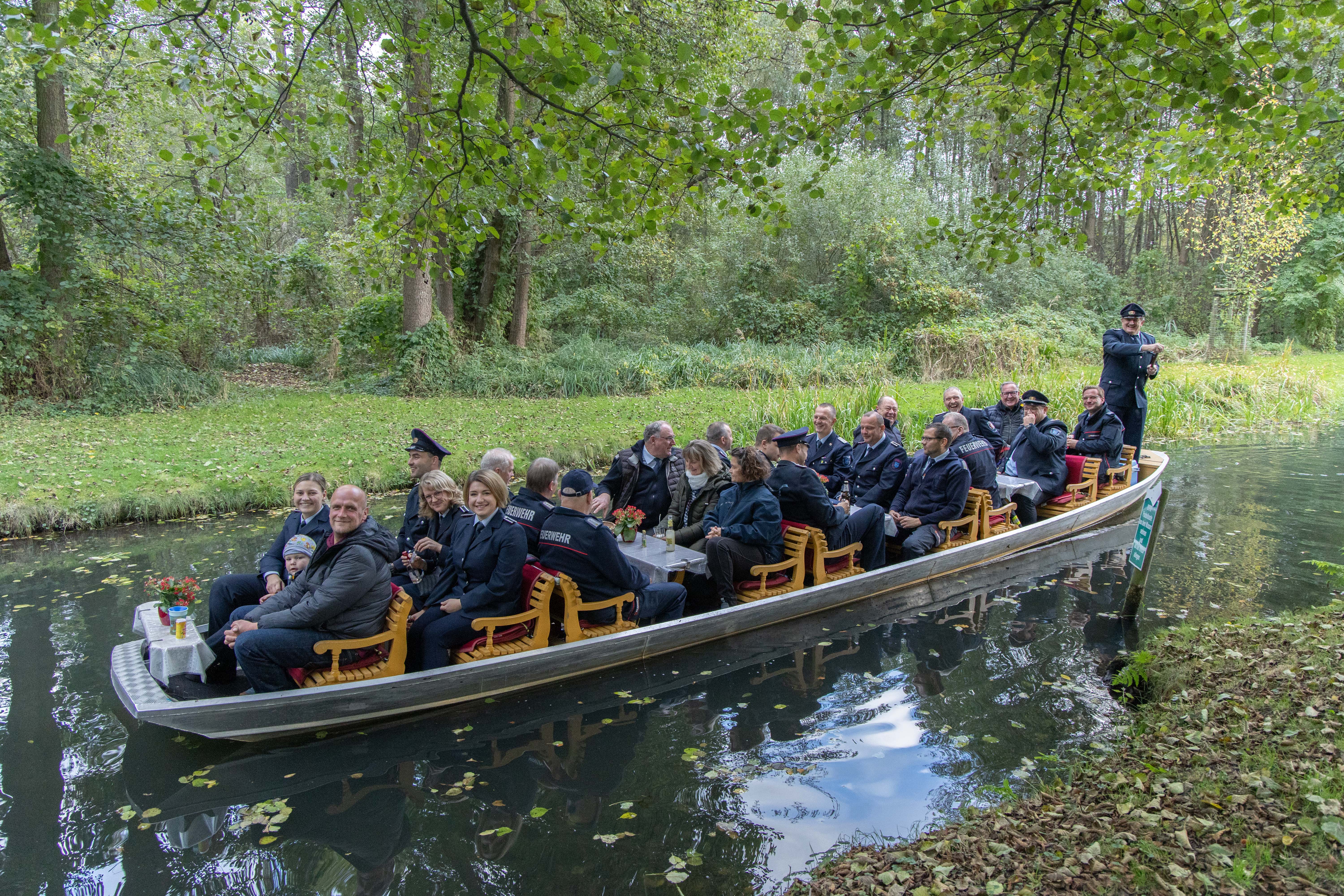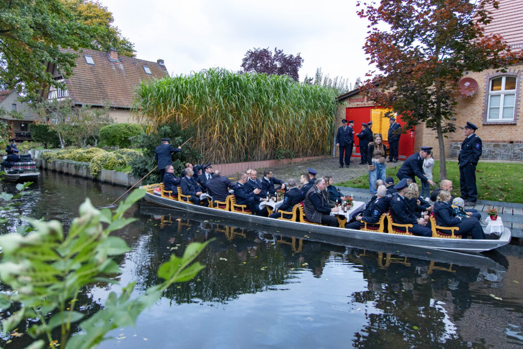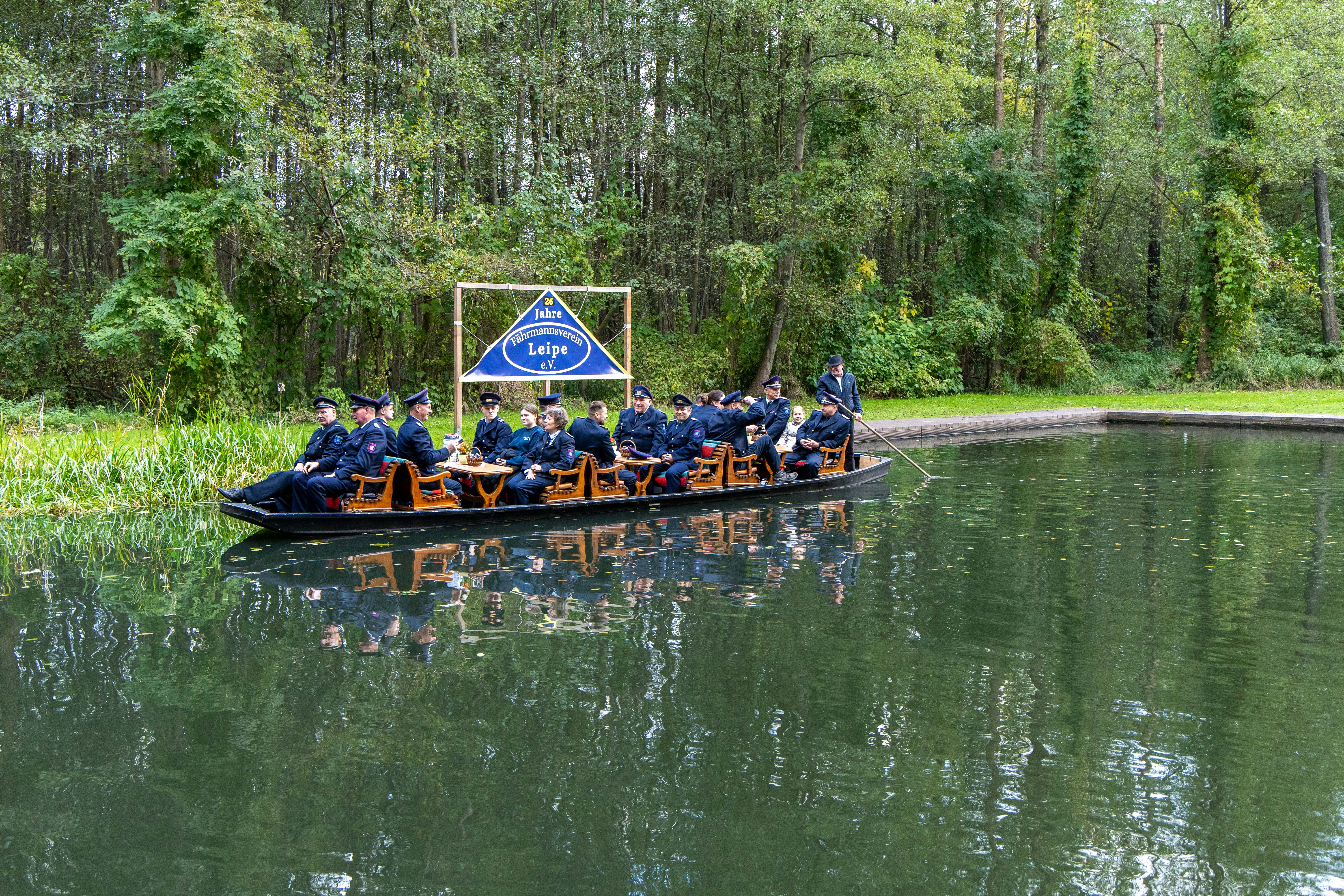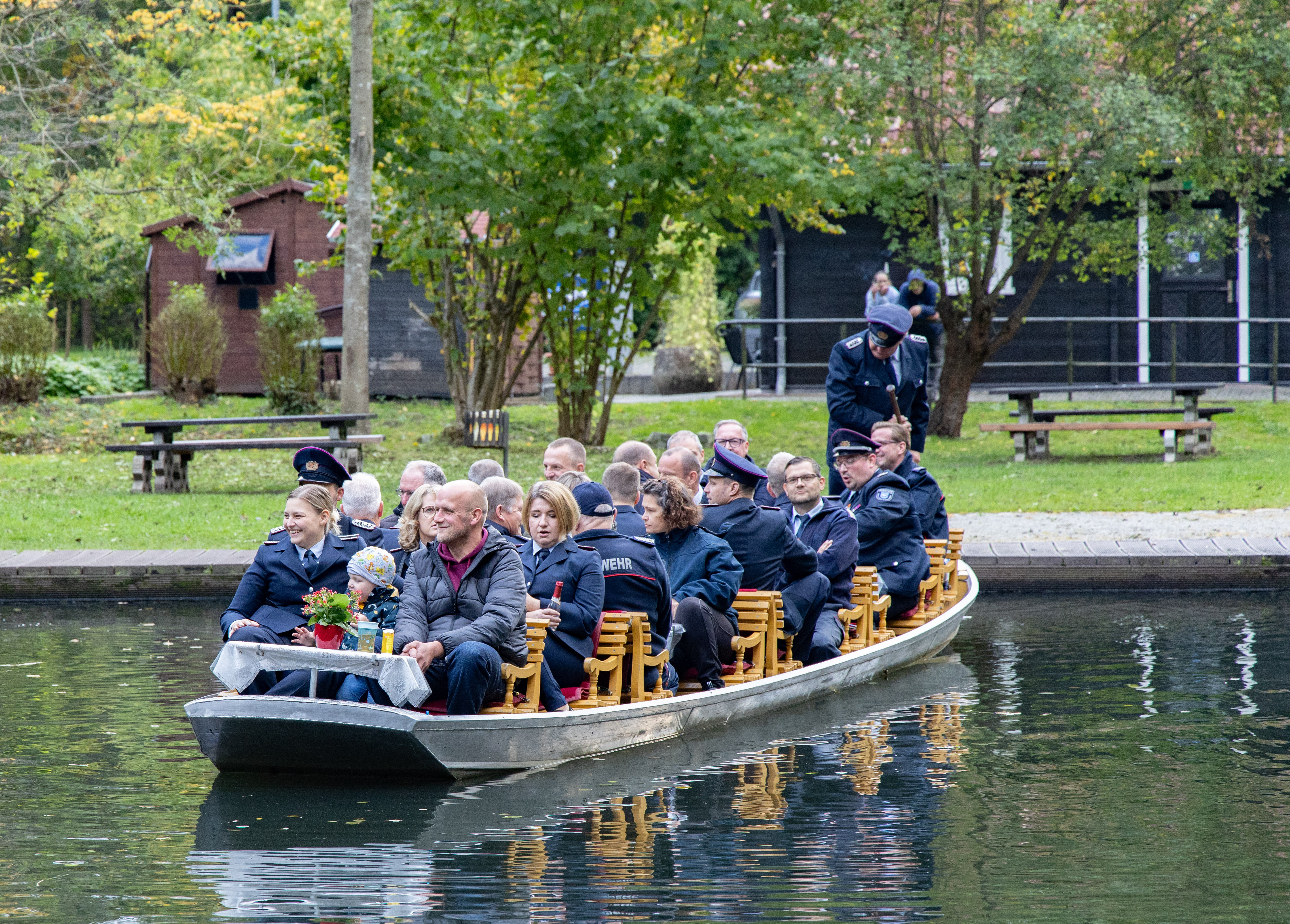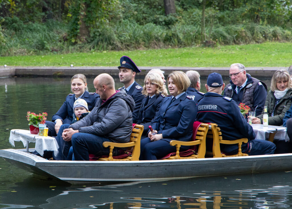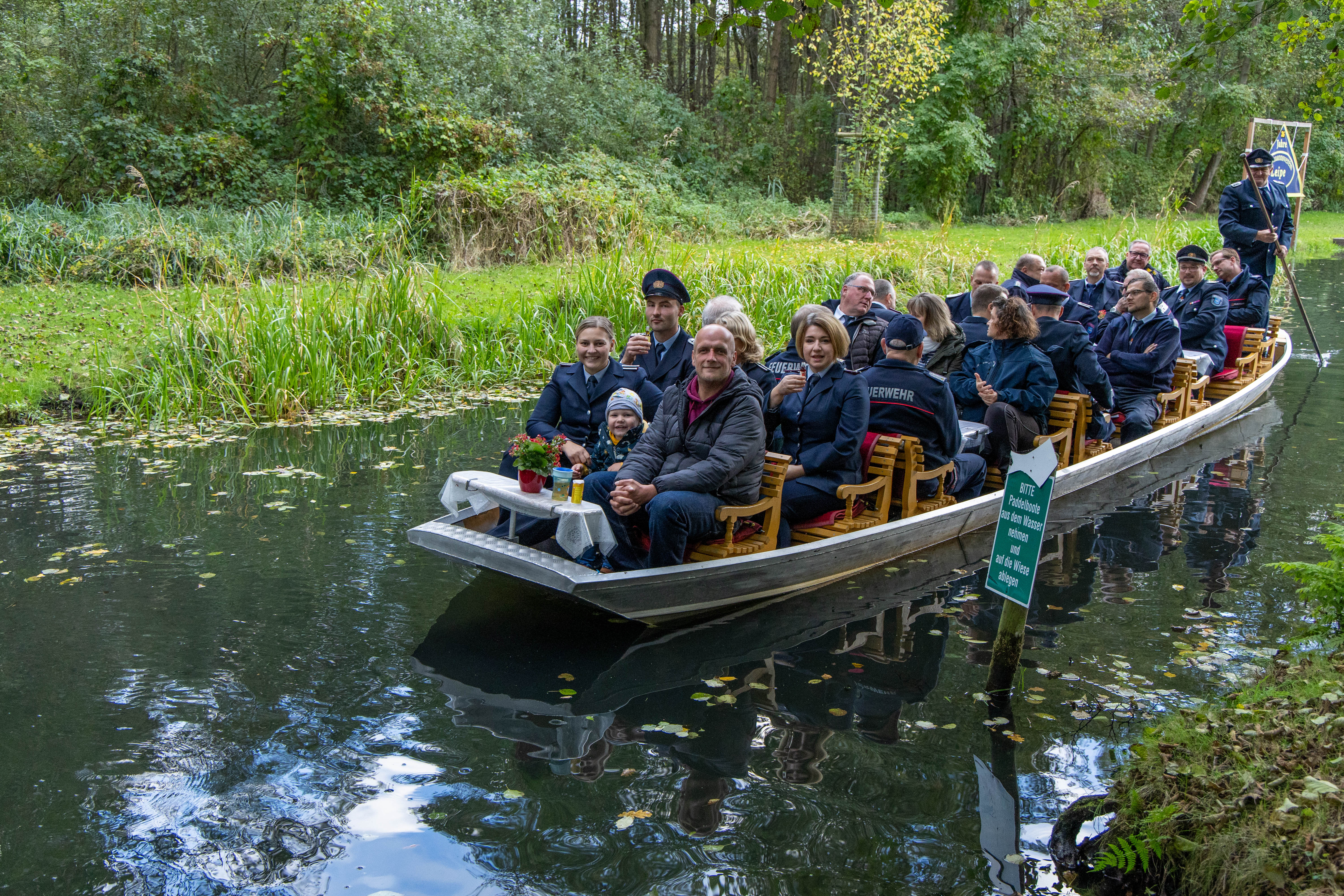 Nur noch wenige Touristen waren in Leipe unterwegs, als sich zwei Kähne, vollbesetzt mit Kameraden und Kameradinnen der Leiper Wehr ebenso, wie mit Abordnungen aus den Nachbarorten, auf den Weg machten. Sie waren gekommen, um nach einer Inselrundfahrt der Einweihung des neuen Tragkraftspritzenfahrzeugs (TSF-W) beizuwohnen, denn das 30 Jahre alte Fahrzeug, war ausgemustert worden.