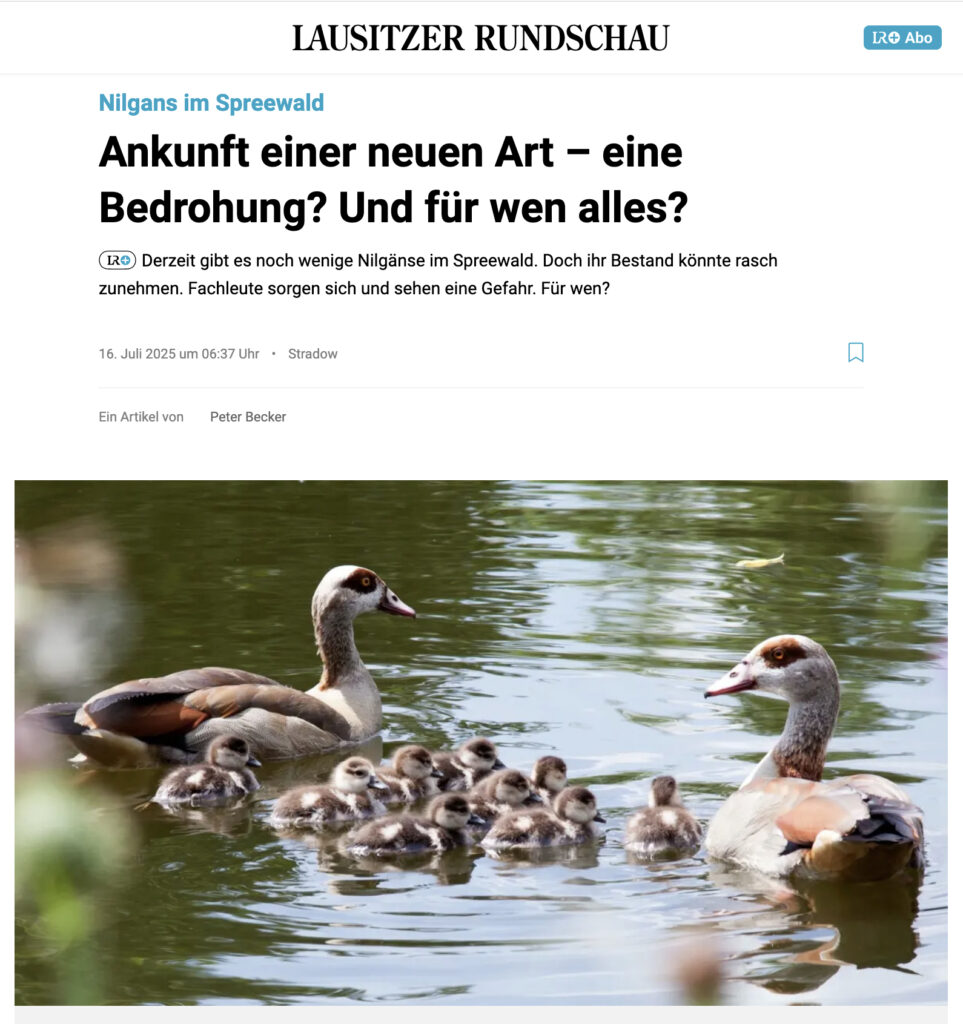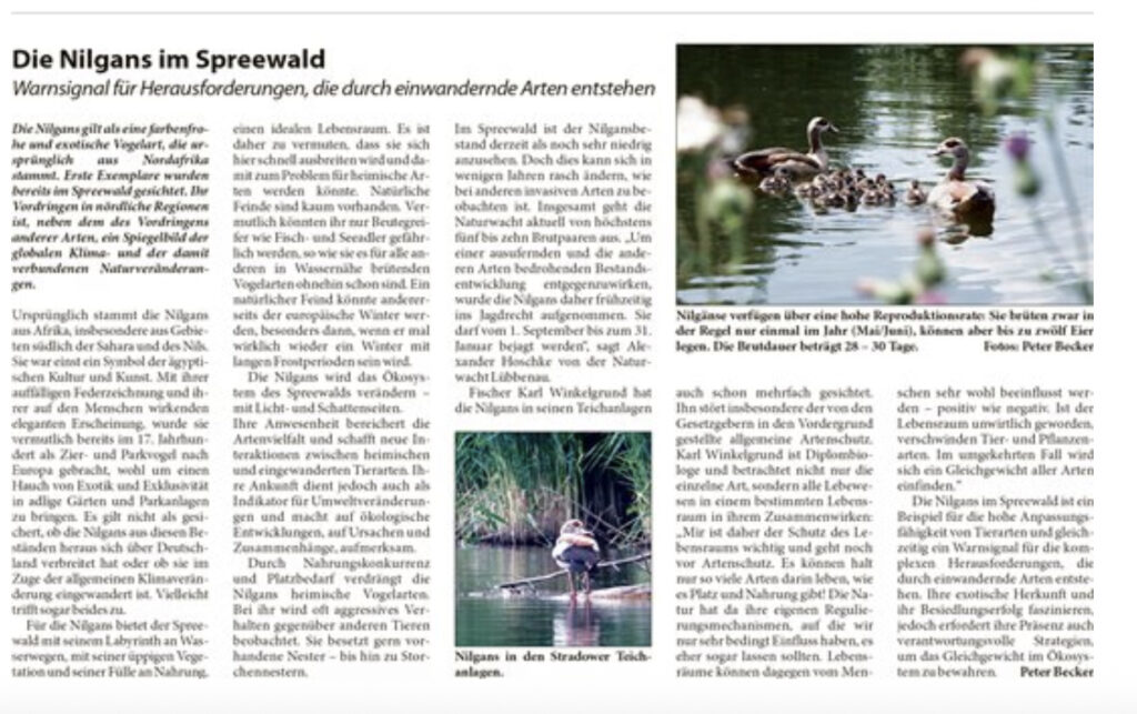 Die Nilgans gilt als eine farbenfrohe und exotische Vogelart, die ursprünglich aus Nordafrika stammt. Erste Exemplare wurden bereits im Spreewald gesichtet. Ihr Vordringen in nördliche Regionen ist, neben dem des Vordringens anderer Arten, ein Spiegelbild der globalen Klima- und der damit verbundenen Naturveränderungen.