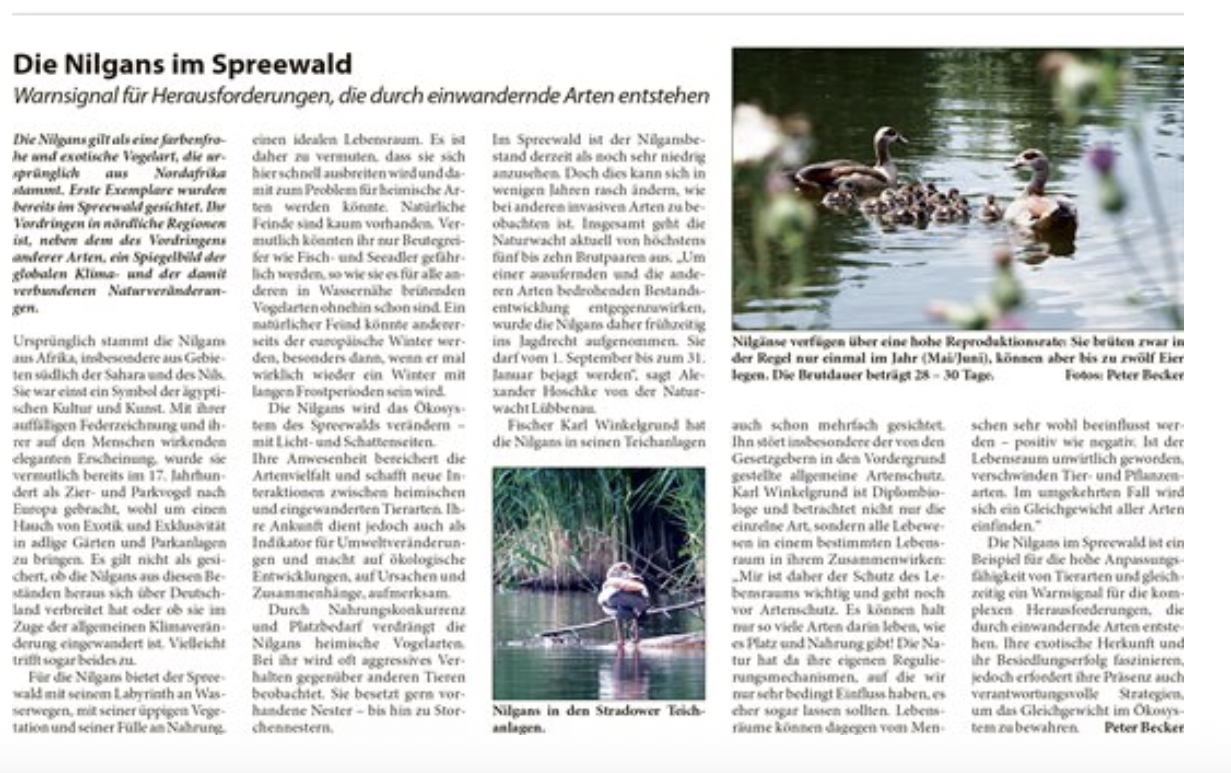 Die Nilgans gilt als eine farbenfrohe und exotische Vogelart, die ursprünglich aus Nordafrika stammt. Erste Exemplare wurden bereits im Spreewald gesichtet. Ihr Vordringen in nördliche Regionen ist, neben dem des Vordringens anderer Arten, ein Spiegelbild der globalen Klima- und der damit verbundenen Naturveränderungen.