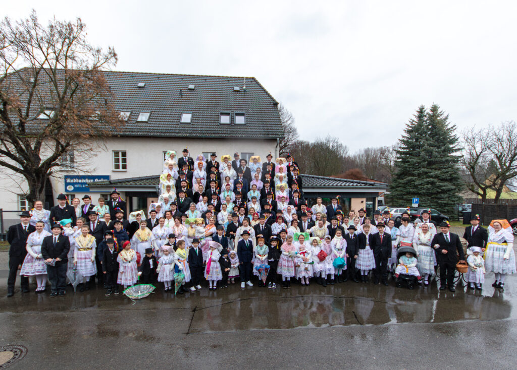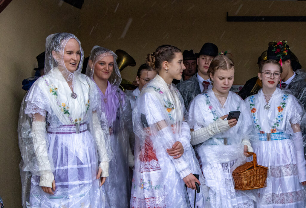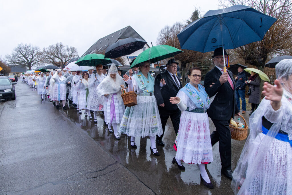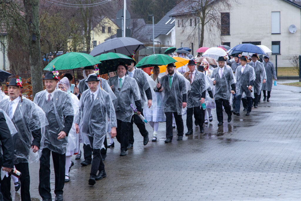 Der Umzug durchs Dorf (und die zahlreichen Pfützen) ging fast wie gewohnt, mit nur etwas kürzeren Tanzpausen dazwischen. Pausenversorger und Dorfälteste bekamen einen Blumenstrauß. Aus triefend nassem Einwickelpapier bekamen Irmgard Roisch, Milika Petrick und Paul Litsche einen frischen Strauß Blumen.