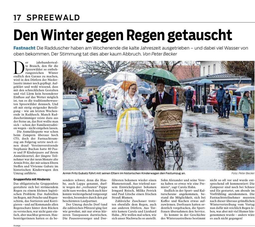 Wie schon am 14. Februar die Lehd’schen, machten sich an 21.und 22. Februar auch die Radduscher daran, den Winter, der es in diesem Jahr besonders wissen wollte, endgültig zu vertreiben! In Raddusch wurde daraus ein richtiger Marathon, denn am Samstag zogen an die 75 Zamperer durchs Dorf, um am Sonntag mit einem starken Fastnachtsumzug noch einmal durchs Dorf zu ziehen (s.u.). Irgendwie schien es geklappt zu haben, denn dem Winter ging die Puste aus: Die Temperaturen kamen endlich mal wieder in den Plus-Bereich – abends war Schnee und Eis Geschichte! 😉