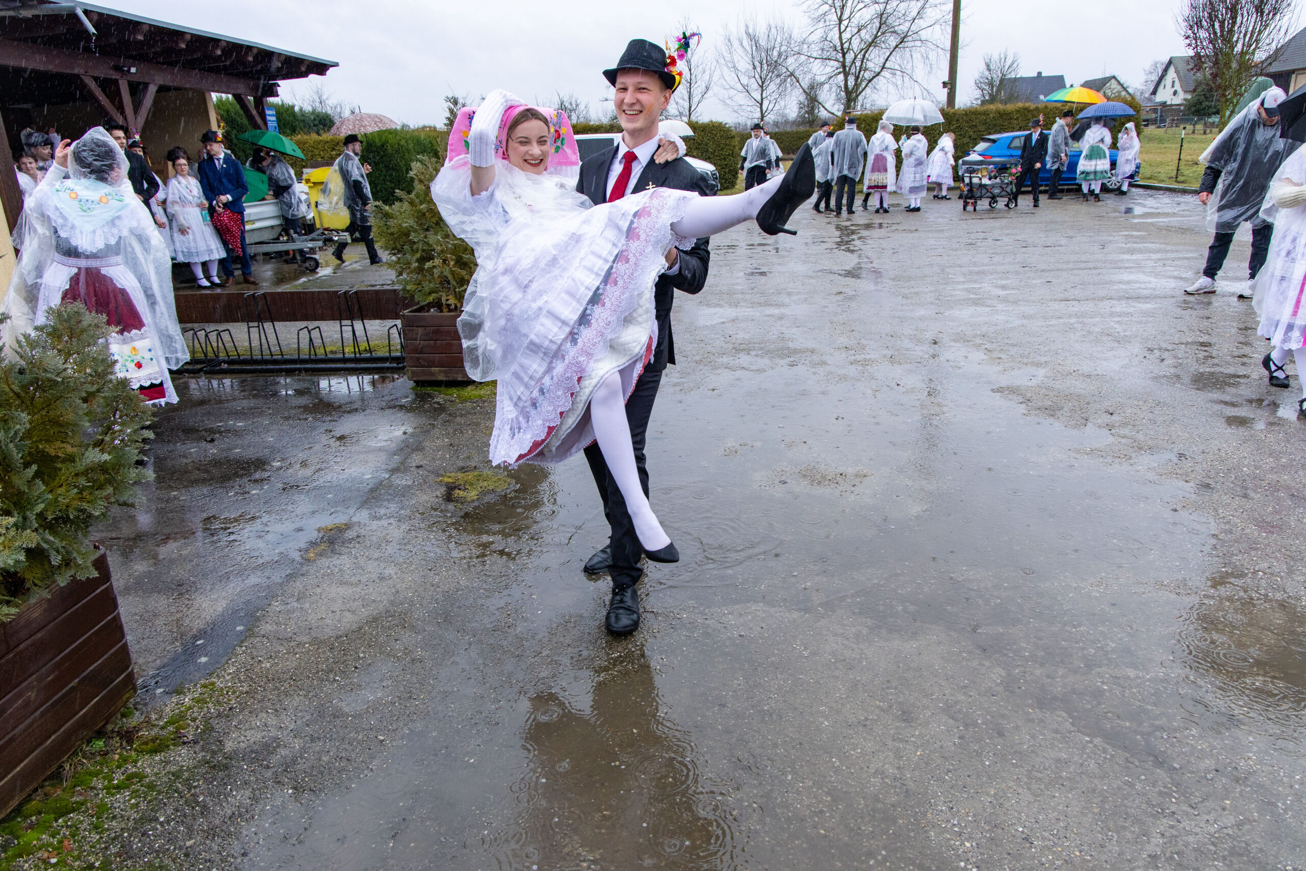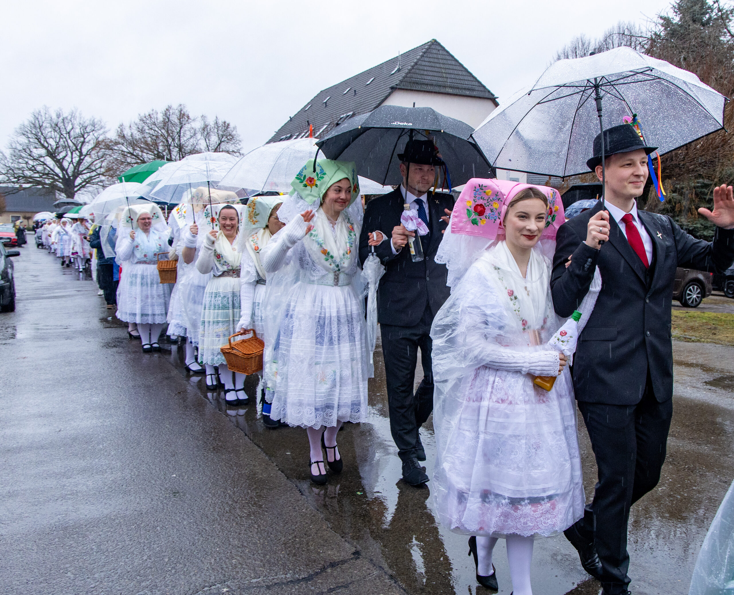Der Umzug durchs Dorf (und die zahlreichen Pfützen) ging fast wie gewohnt, mit nur etwas kürzeren Tanzpausen dazwischen. Pausenversorger und Dorfälteste bekamen einen Blumenstrauß. Aus triefend nassem Einwickelpapier bekamen Irmgard Roisch, Milika Petrick und Paul Litsche einen frischen Strauß Blumen.