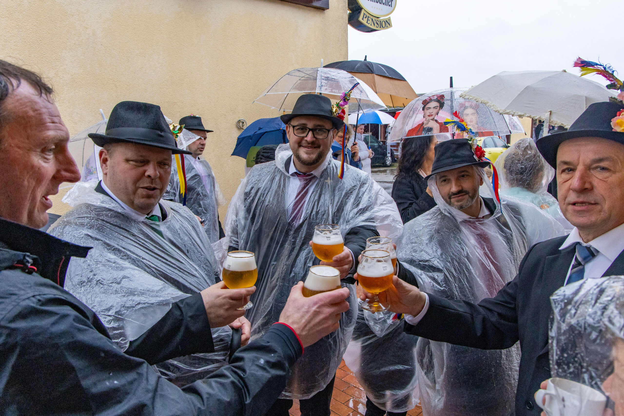 Das obligatorische Gruppenfoto gestaltete sich bei strömendem Regen zu einem kleinen logistischen Problem: Das Aufstellen im Regen, mit Poncho und Regenschirm, das Sortieren und Korrigieren – und auf Kommando allen Regenschutz hinter dem Rücken zu verstecken, war nicht ganz einfach, aber machbar gewesen. Haubenträgerinnen hatten es da besonders schwer, denn die Haube, auch Lappa genannt, durfte wegen der „verbauten“ Pappe nicht nass werden, doch auch hier konnte weitestgehend vorgesorgt werden, besonders durch den gut beschirmten Laufpartner.