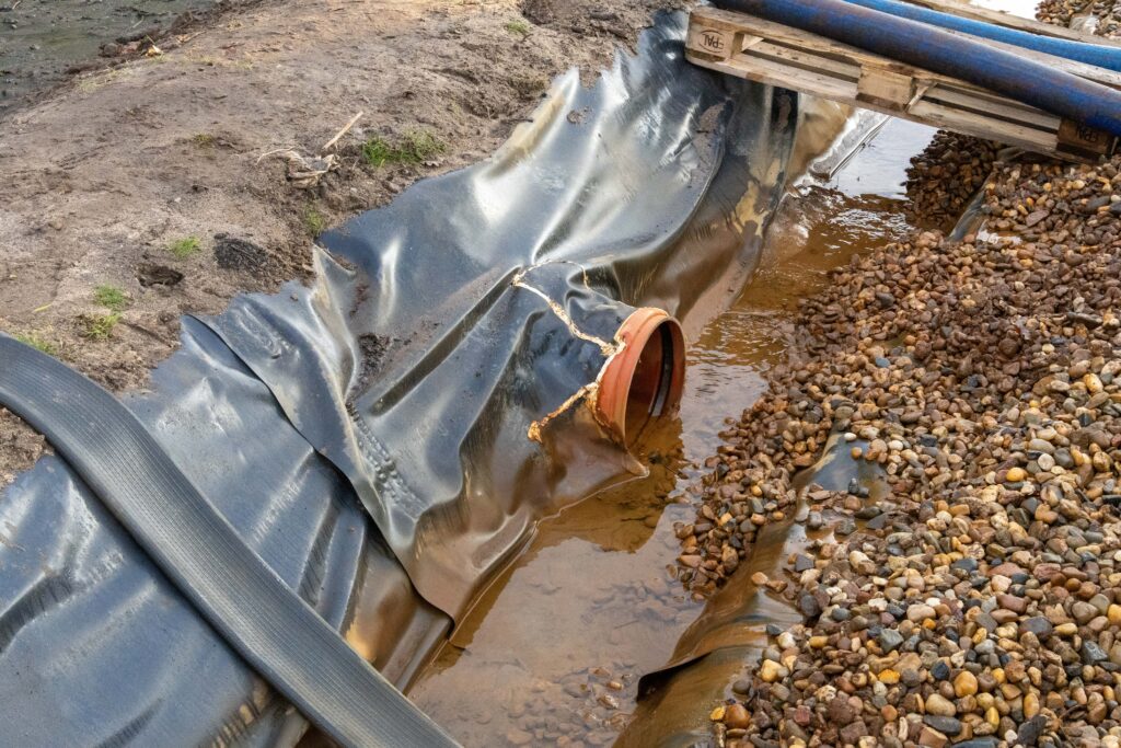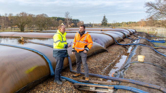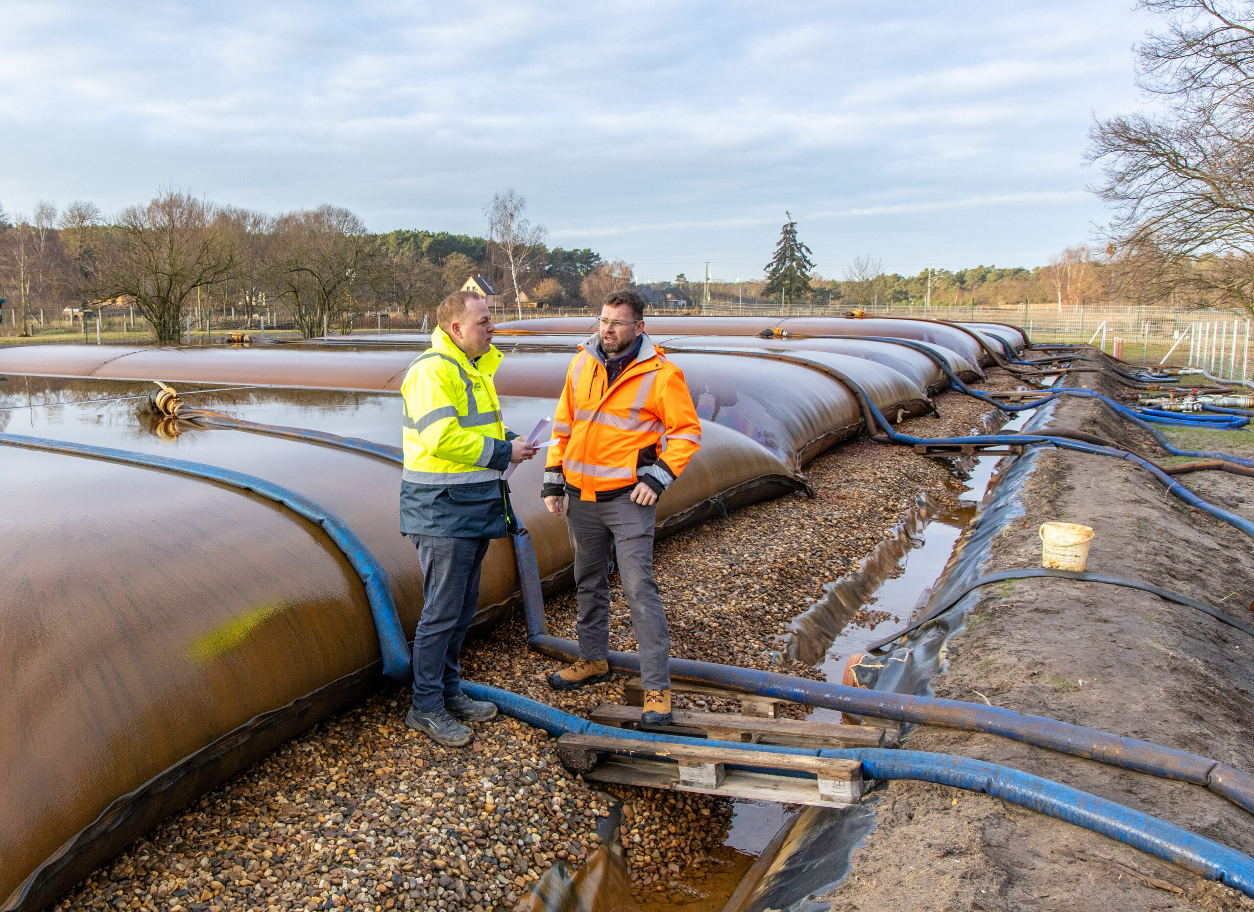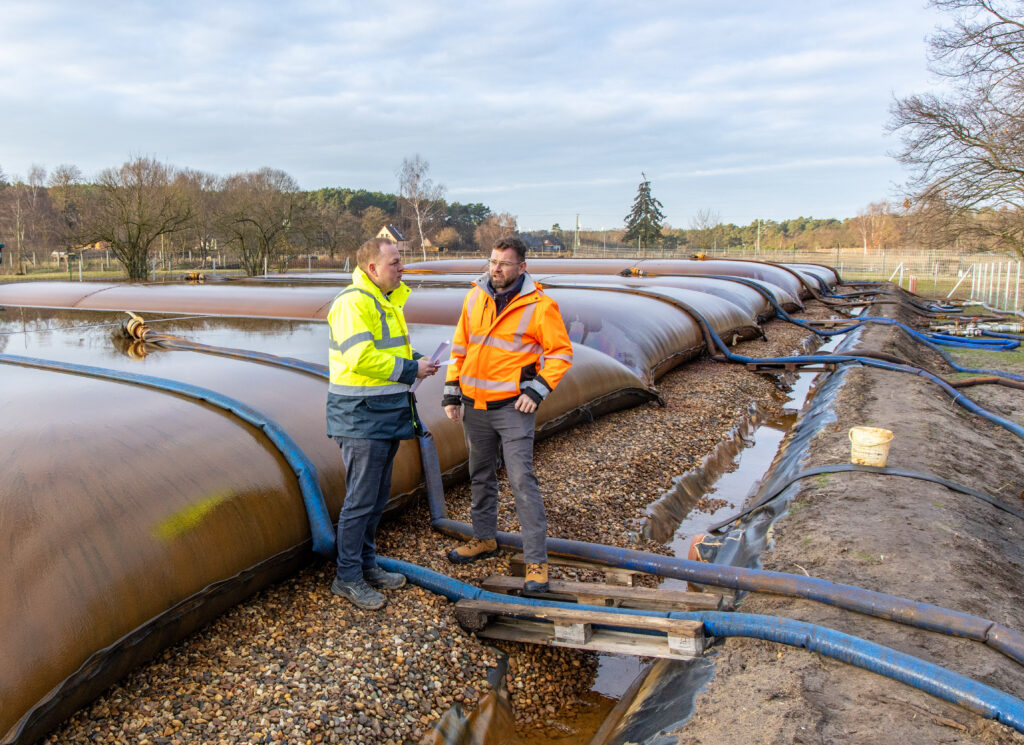 Riesige, wie überdimensionale Kissen anmutende Säcke, fachmännisch geotextile Entwässerungsschläuche (Geotubes) genannt, ziehen derzeit die Blicke der Radduscher auf sich. Unweit des Sportplatzes haben Beschäftigte des Wasser- und Bodenverbands Oberland Calau (WBV) eine 2000 Quadratmeter große Fläche für die Aufnahme der Tubes ertüchtigt. Diese werden derzeit über eine Rohrleitung mit abgesaugtem Schlamm aus dem in der Nachbarschaft liegenden Grubenwasserabsetzbecken befüllt. Das Filtratwasser läuft über eine Gefällestrecke zurück und die Säcke füllen sich allmählich mit den festen Bestandteilen.
