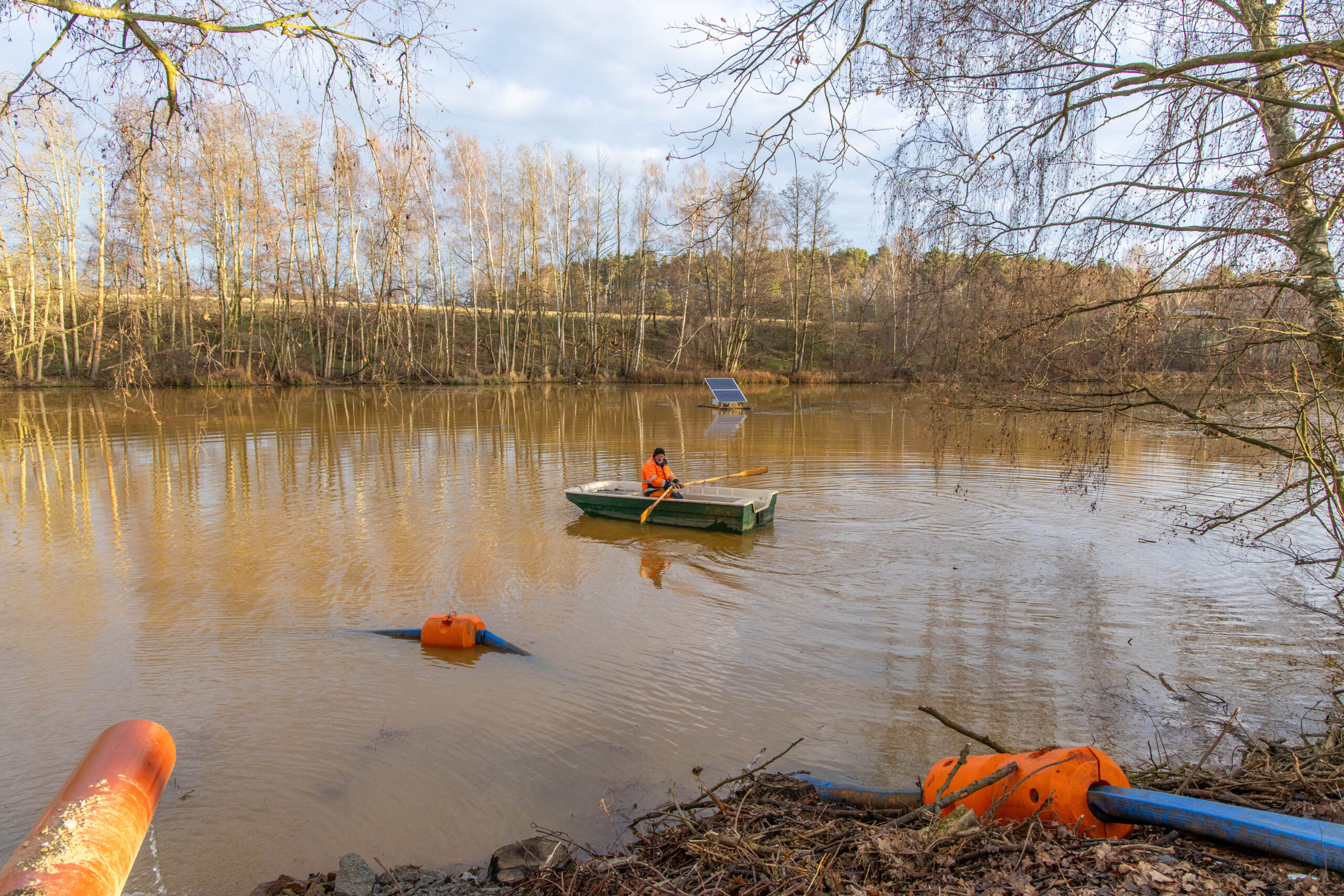 Projektingenieur Jens Kühne vom Wasser- und Bodenverband. „Eine Lotung im Jahr 2023 hat ergeben, dass das Absetzbecken stärker verschlammt ist, als bisher angenommen. Es befinden sich etwa 5 300 Kubikmeter Eisenhydroxidschlamm am Gewässerboden, den wir nun mit einer Saug-Spül-Pumpe in die Tubes befördern. Nach der Austrocknung des Schlammes wird dieser analysiert und danach über eine fachgerechte Verwertung oder Entsorgung entschieden.“